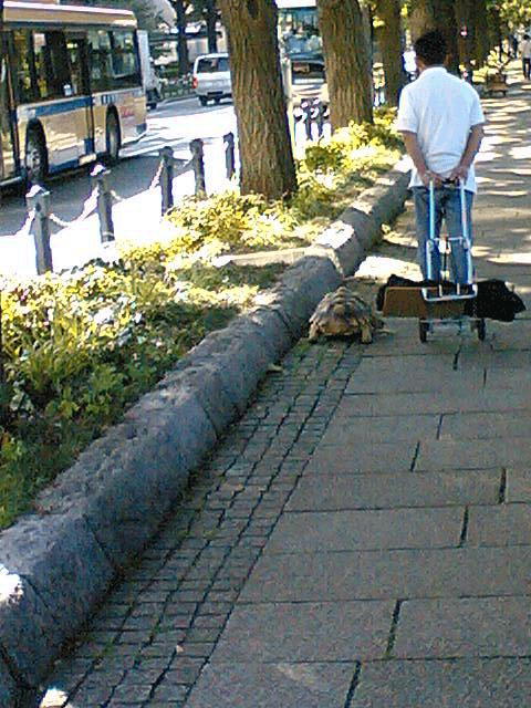 カメと一緒に歩いているおじさんが居ました