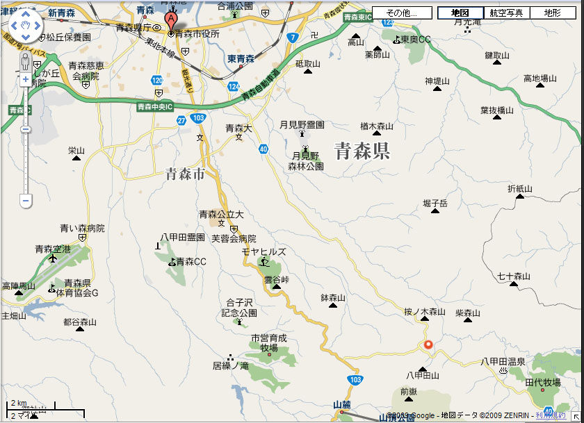 地図上のAが青森市役所で、八甲田山の近くに有る赤丸が目的地です。