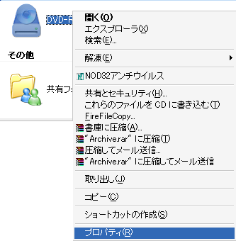 まずマイコンピュータを開いて、CDドライブのプロバティを出します。