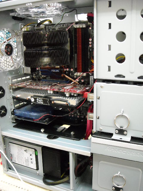 上からCPU、VGA、VGA排熱用ファン、サウンドカードと刺さっております。